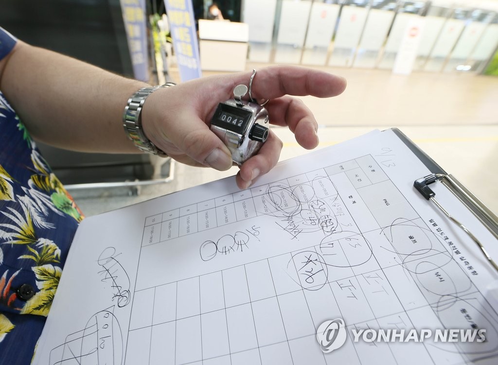 | ▲ 힘든 제주 관광통계 (제주=연합뉴스) 변지철 기자 = 13일 오전 제주국제공항 1층 국내선 도착장 앞에서 제주도관광협회 소속 관광통계 담당자들이 눈셈조사를 통해 골프객, 낚시객, 등반·올레길, 단체관광객 등 여행목적에 따른 관광객 분류 작업을 하고 있다. 사진은 분류작업에 쓰는 계수기(카운터기)와 일일이 숫자를 적은 메모지의 모습. 2021.9.13 bjc@yna.co.kr |