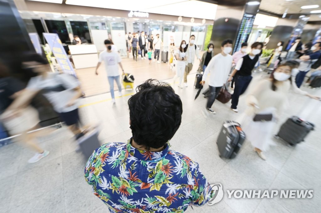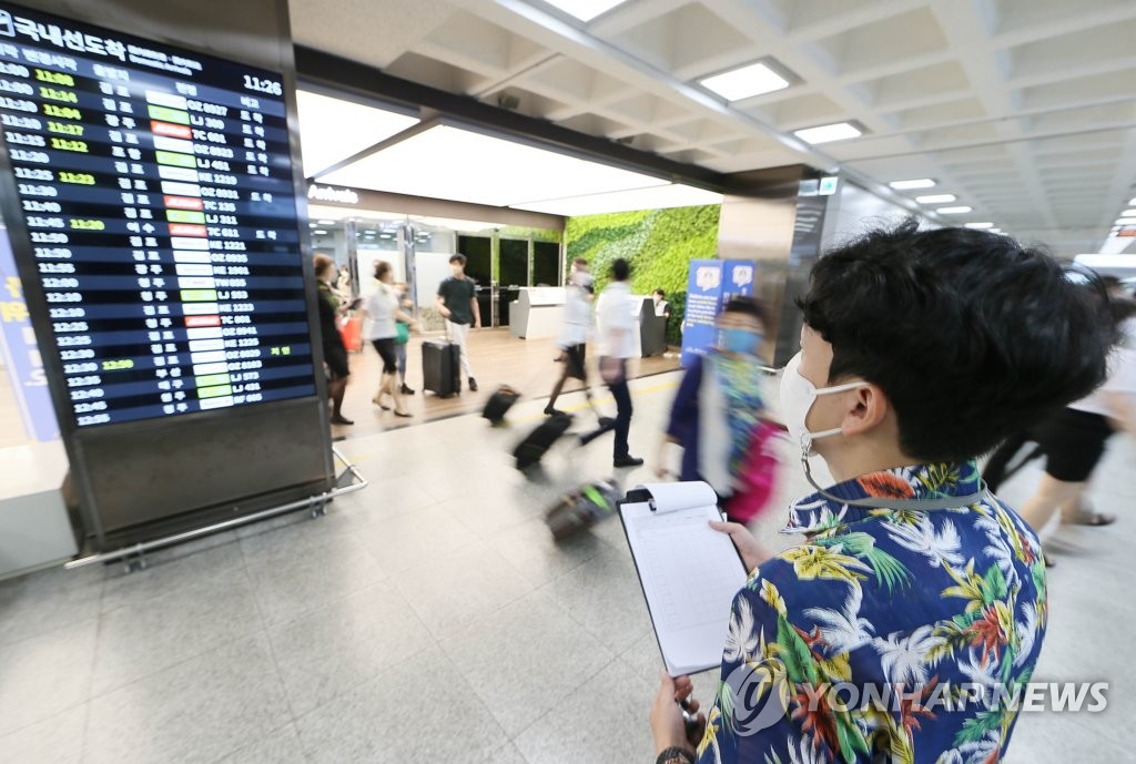 | ▲ 제주 관광통계 "바쁘다 바빠" (제주=연합뉴스) 변지철 기자 = 13일 오전 제주국제공항 1층 국내선 도착장 앞에서 제주도관광협회 소속 관광통계 담당자들이 눈셈 조사를 통해 골프객, 낚시객, 등반·올레길, 단체관광객 등 여행목적에 따른 관광객 분류 작업을 하고 있다. 2021.9.13 bjc@yna.co.kr |