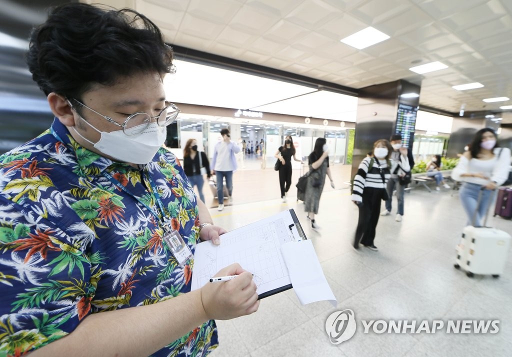 | ▲ "제주 관광통계 이렇게" (제주=연합뉴스) 변지철 기자 = 13일 오전 제주국제공항 1층 국내선 도착장 앞에서 제주도관광협회 소속 김홍경 제주도관광협회 대리가 통계작업을 설명하고 있다. 2021.9.13 bjc@yna.co.kr |