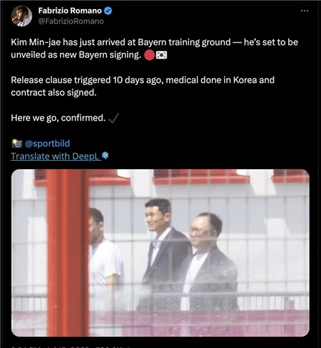 로마노 기자는 "김민재가 방금 뮌헨 훈련장에 도착했다. 곧 영입 발표가 있을 것"이라면서 "이미 메디컬 테스트는 한국에서 마쳤으며 계약서 사인도 끝났다"고 적었다.