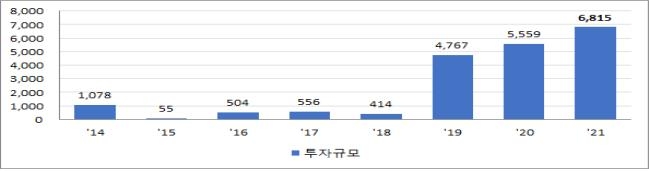 | ▲ This image, provided by the Ministry of Trade, Industry and Energy on Jan. 11, 2022, shows investment by South Korean companies that returned home from overseas between 2014 and 2021. (PHOTO NOT FOR SALE) (Yonhap) |