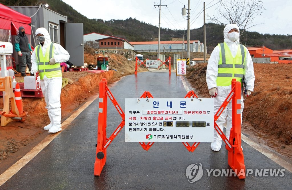 | ▲ Quarantine officials block a road leading to a poultry farm in Hampyeong, 383 kilometers south of Seoul, on Dec. 5, 2022, after a highly pathogenic strain of H5N1 of avian influenza was detected there earlier in the day. (Yonhap) |
