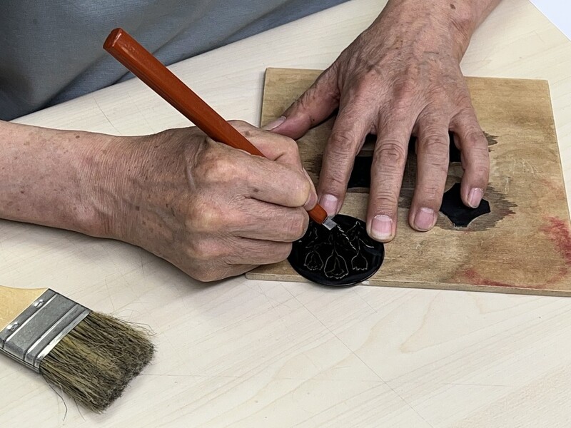 금속으로 만든 조형물 위 칠해진 옻칠을 긁어내기 위해 수강생들이 조각칼을 들었다.