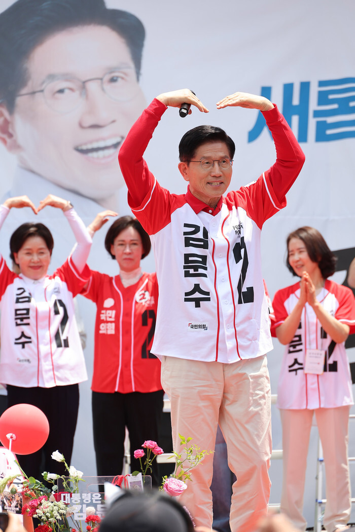 Kim Moon-soo, the presidential candidate of the conservative People Power Party, forms a heart with his hands toward voters during a campaign stop in Goyang, northwest of Seoul on May 21, 2025, ahead of the June 3 presidential election. (Yonhap)
