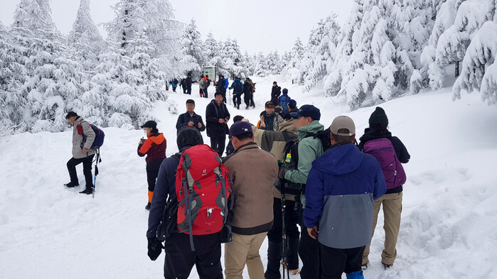 Hikers enjoy trekking at the Daegwallyeong Pass in Gangneung, Gangwon Province, on Feb. 25, 2024. (Yonhap)