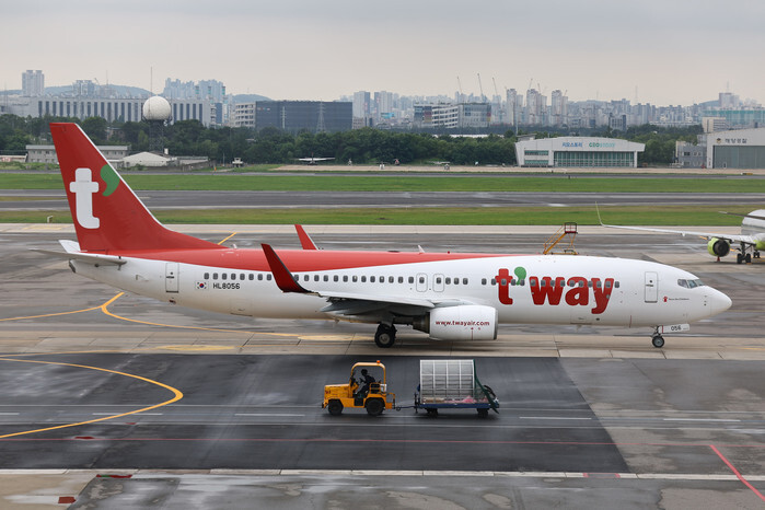 A plane of the low-cost carrier T'way Air Co. prepares to take off at Gimpo airport in Seoul on June 25, 2025, one day after Daemyung Sono Group virtually completed its acquisition of the company by holding an extraordinary shareholders' meeting and appointing a new board of directors. (Yonhap)