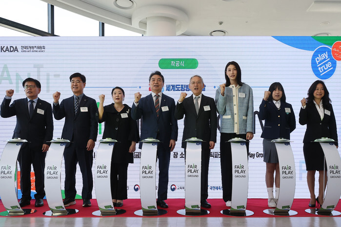 Culture, Sports and Tourism Minister Yu In-chon (5th from L), volleyball star Kim Yeon-koung (6th from L) and other participants pose for a group photo during a ceremony on the 18th floor of Olympic Parktel in Seoul on April 11, 2025, to start the establishment of an anti-doping education hub, Fair Play Ground, on the entire floor. (Yonhap)
