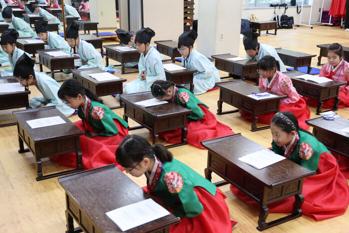 School kids donning traditional clothes take part in a summer vacation program at an education facility in the southeastern coastal city of Busan on July 28, 2025, to learn etiquette and practice traditional courtesies. (Yonhap)