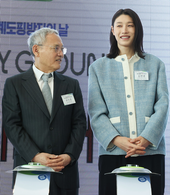 Culture, Sports and Tourism Minister Yu In-chon (L) and volleyball star Kim Yeon-koung attend a ceremony on the 18th floor of Olympic Parktel in Seoul on April 11, 2025, to start the establishment of an anti-doping education hub, Fair Play Ground, on the entire floor. (Yonhap)