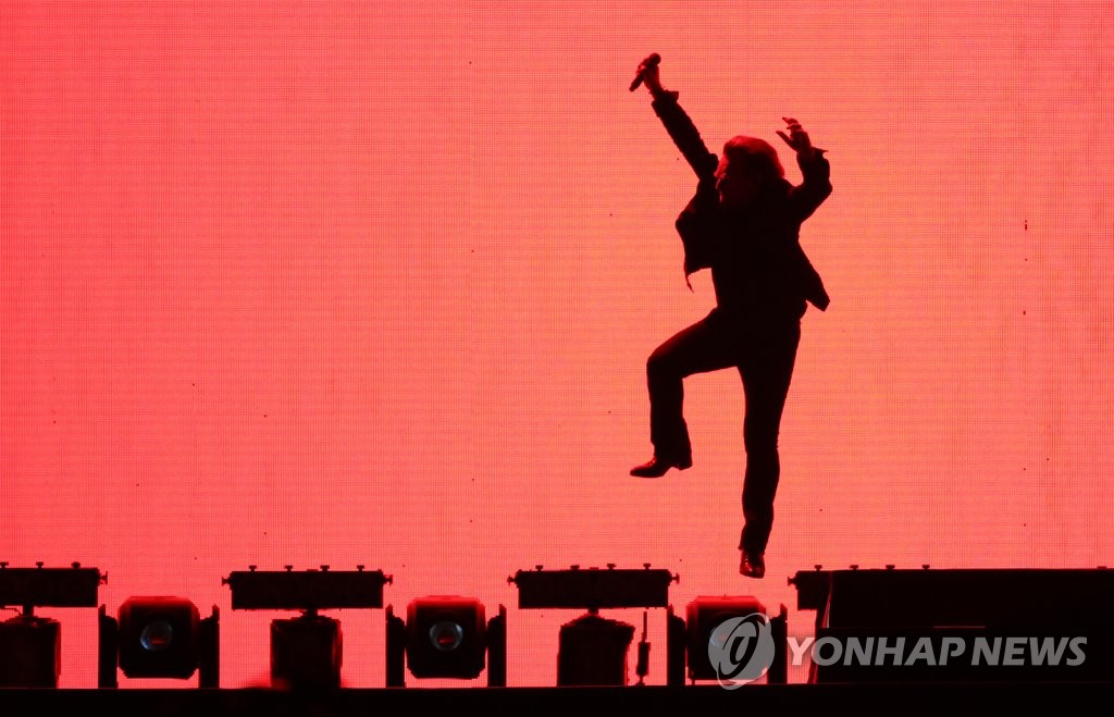 | ▲ 점프하는 U2 보노 2019년 12월 8일 밴드 U2의 보노가 서울 구로구 고척스카이돔에서 첫 내한 공연을 펼치는 모습. [연합뉴스 자료사진. 재판매 및 DB 금지] |