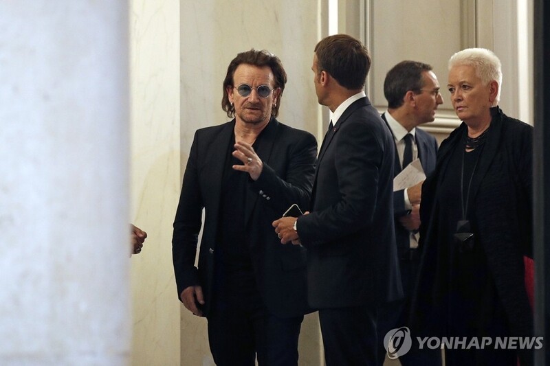 | ▲ 마크롱 대통령 만난 아일랜드 록밴드 U2 멤버 보노 (EPA=연합뉴스) 2018년 9월 10일 U2의 리더 보노가 프랑스 파리 엘리제 궁에서 에마뉘엘 마크롱 대통령과 대화를 나누고 있다. |