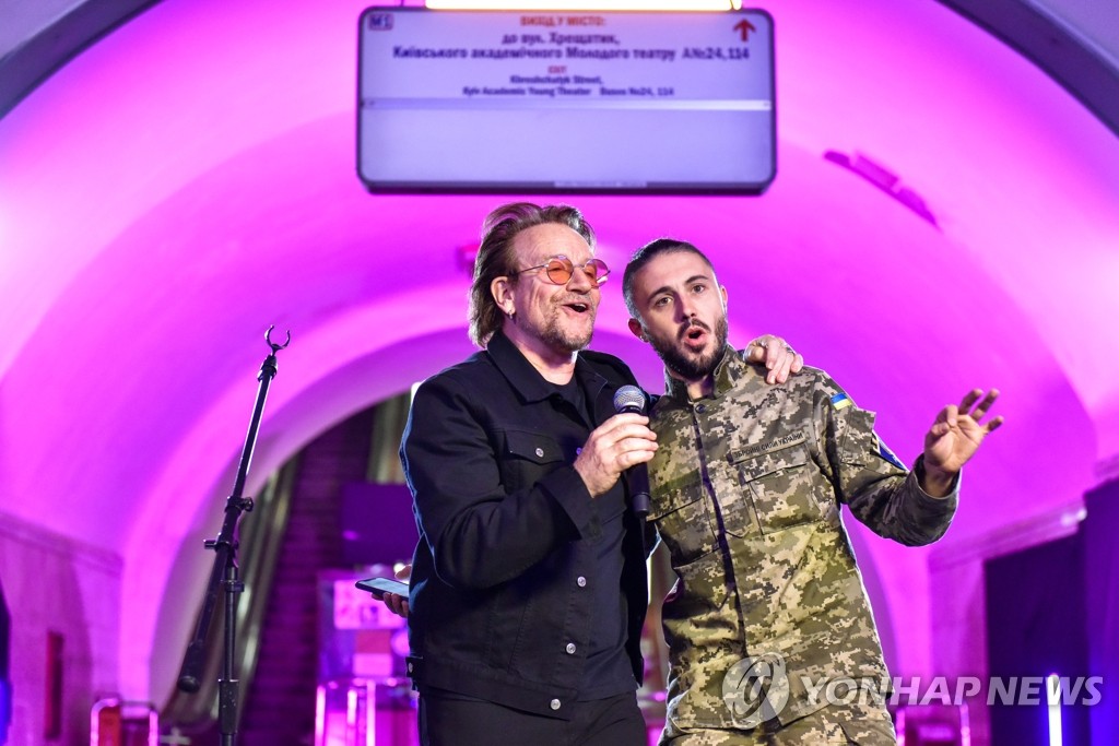| ▲ 키이우 지하철역서 '깜짝 공연' 펼치는 U2 보노 (키이우 EPA=연합뉴스) 2022년 5월 9일 아일랜드 록밴드 U2의 리드싱어 보노(왼쪽)가 우크라이나군에서 복무 중인 가수 타라스 토폴리아(오른쪽)와 함께 8일(현지시간) 러시아의 침공 이후 방공호로 쓰이는 우크라이나 수도 키이우(키예프)의 흐레샤티크 지하철역 안에서 즉석 공연을 펼치고 있다. |