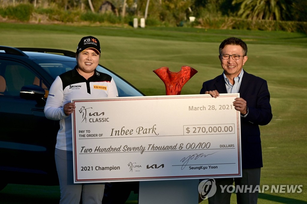 | ▲ LPGA KIA 클래식 우승상금 적힌 피켓 든 박인비 (칼즈배드 AFP/게티이미지=연합뉴스) 28일(현지시간) 미국 캘리포니아주 칼즈배드 아비아라 골프클럽에서 열린 미국여자프로골프(LPGA) 투어 KIA 클래식에서 우승한 박인비(왼쪽ㆍ33)가 윤승규(오른쪽) 기아 미국판매법인(KMA) 최고경영자(CEO) 겸 사장과 함께 대회 우승상금 27만 달러(약 3억550만 원)가 적힌 피켓을 들고 있다. 박인비는 최종합계 14언더파 274타를 기록, 공동 2위 에이미 올슨과 렉시 톰프슨(이상 미국·9언더파 279타)을 5타 차로 따돌리고 정상에 올라 개인 통산 21번째 우승을 챙겼다. knhknh@yna.co.kr |