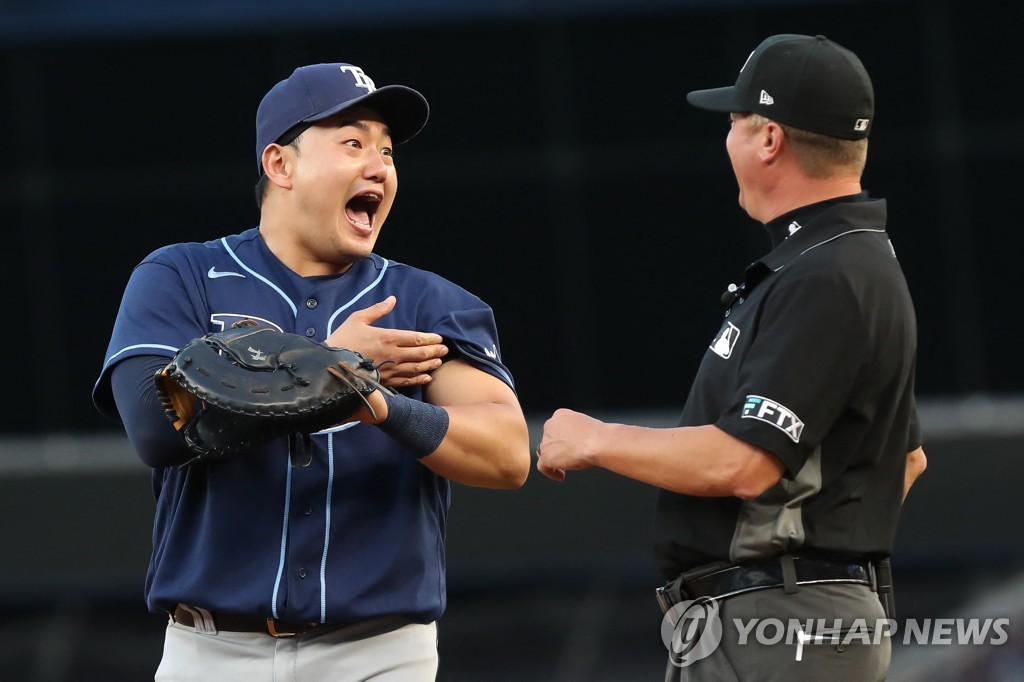 | ▲ In this USA Today Sports photo via Reuters, Tampa Bay Rays first baseman Choi Ji-man (L) reacts during a chat with first base umpire Cory Blaser during the bottom of the fourth inning of a Major League Baseball regular season game at Yankee Stadium in New York on June 14, 2022. (Yonhap) |