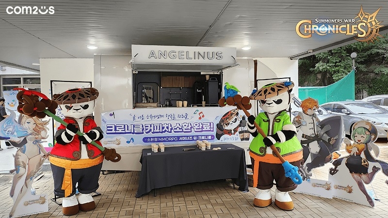 ▲ 컴투스[078340]는 '서머너즈워: 크로니클' 출시를 기념해 지난 22일부터 25일까지 무더위에 지친 물류센터와 아동복지 시설에 게임 속 캐릭터 '웅묘무사'와 함께 엔제리너스 커피차, 무탄산 레모네이드 등 시원한 음료를 배달하는 행사를 진행했다. 컴투스는 '크로니클' 이용자를 대상으로 사연을 모집해 이같은 이벤트를 기획했다고 밝혔다. (서울=연합뉴스)