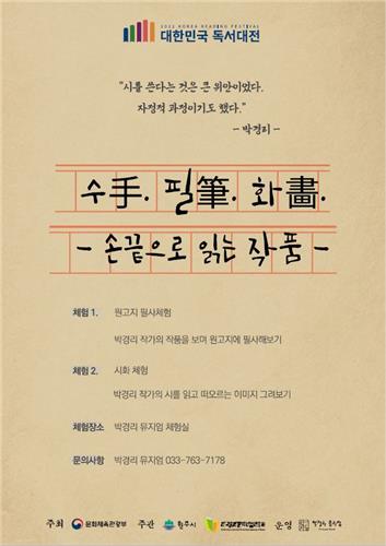 이와 함께 원주시립중앙도서관은 국내 최대 규모의 독서문화 축제 2022 대한민국 독서대전 박경리 연계 독서 특화 프로그램인 '수필화-손끝으로 읽는 작품'을 내달 2일부터 11월까지 원주시 흥업면 박경리 뮤지엄에서 진행한다.