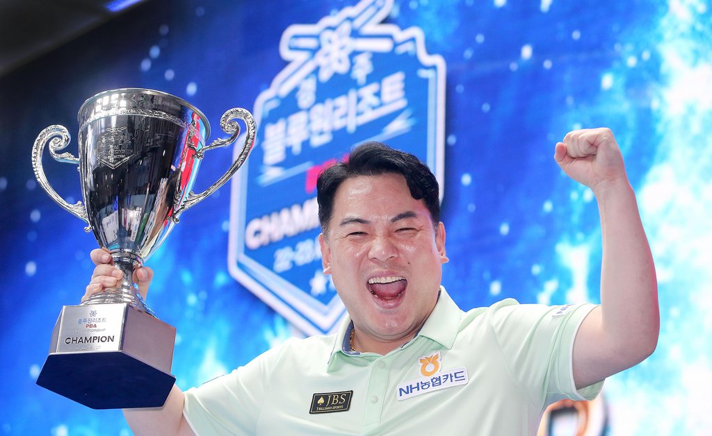 | ▲ 조재호, 프로당구 PBA 첫 승 (서울=연합뉴스) 한국 아마추어 당구 최강자로 불렸던 조재호(42·NH농협카드)가 프로당구 PBA 투어 무대 11번의 도전 끝에 첫 우승컵을 들어 올렸다. 조재호는 지난 27일 경북 경주 블루원리조트에서 열린 프로당구 2022∼2023시즌 개막전인 경주 블루원리조트 PBA-LPBA 챔피언십 PBA 결승전에서 스페인의 다비드 사파타(블루원리조트)를 세트 점수 4-1(15-9 9-15 15-9 15-7 15-1)로 제압했다. 사진은 PBA 개막전 우승 차지한 조재호. 2022.6.28 [PBA 제공. 재판매 및 DB 금지] photo@yna.co.kr |