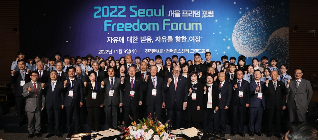 | ▲ Participants pose for photo during the inaugural 2022 Seoul Freedom Forum, co-hosted by the Federation of Korean Industries and The Heritage Foundation, in Seoul, on Nov. 9, 2022. (PHOTO NOT FOR SALE) (Yonhap) |