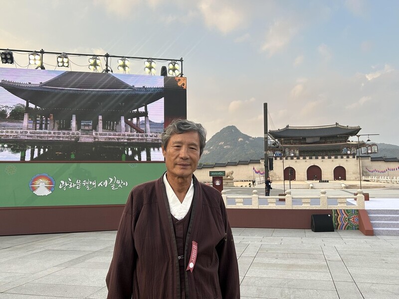 | ▲ 광화문 월대 복원 공사를 총괄한 도석수 (서울=연합뉴스) 김예나 기자 = 임동조 경기도 무형문화재 석장 보유자가 지난 15일 서울 광화문 광장에서 열린 '광화문 월대 새길맞이' 행사에서 연합뉴스와 인터뷰하고 있다. 임 석장은 문화유산 수리·복원 분야의 산증인으로 광화문 월대 복원을 총괄하는 도석수(우두머리 석공)로 작업을 지휘했다. 2023.10.16 yes@yna.co.kr |