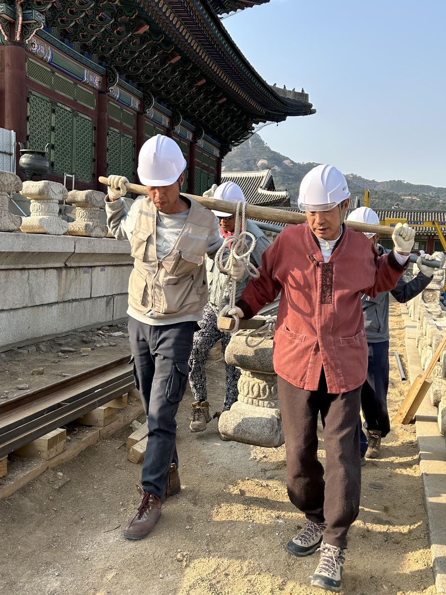 문화재청에 따르면 올해 6월부터 도석수(우두머리 석공)인 임 석장을 포함해 약 30명의 장인이 현장에 투입돼 월대 주변을 울타리처럼 두른 난간석을 배열하고 각종 석조 부재를 완성했다.