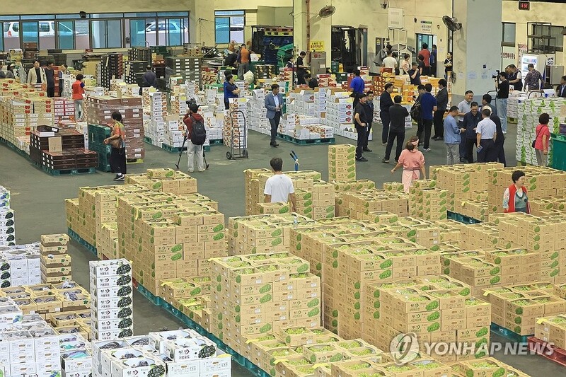 | ▲ 추석 대목 과일 경매 활발 (제주=연합뉴스) 박지호 기자 = 추석을 앞둔 25일 오전 제주시 일도2도 제주시농협 농산물공판장에 경매에 부쳐질 과일 상자들이 가득 쌓여 있다. 2023.9.25 jihopark@yna.co.kr |