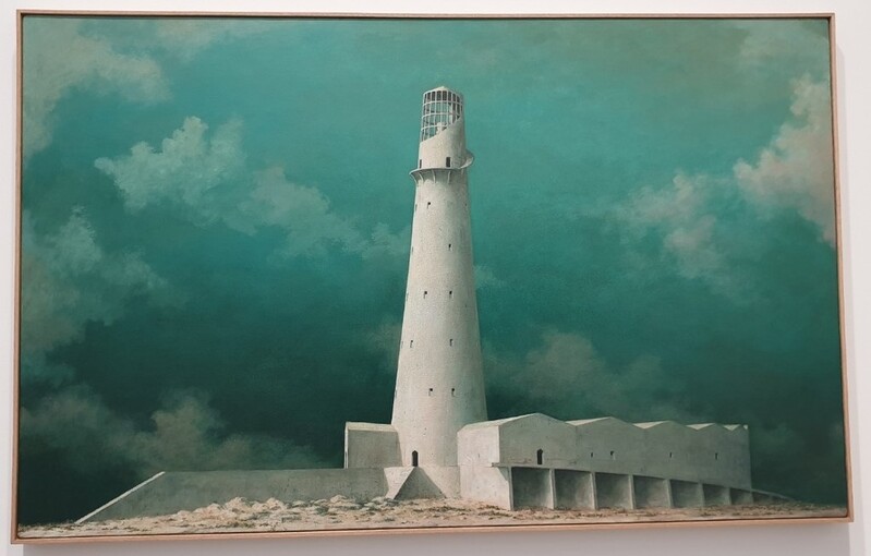 그의 작품에는 대부분 세로로 솟아오른 거대한 구조물들이 등장한다. 정교하게 묘사된 구조물들은 어디선가 본 듯도 하지만 모두 작가의 상상 속에서 만들어낸 것이다. 별다른 배경 없이 낮은 수평선만이 펼쳐진 허허벌판 위에 우뚝 솟아 있는 그림 속 건축물들은 환상적이면서도 한편으로는 뭔가 불안한 느낌을 주기도 한다.