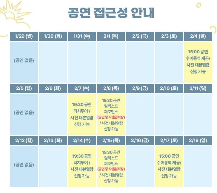 접근성 매니저는 대본 열람 서비스, 사전에 무대 동선을 파악할 수 있는 터치 투어 등 공연이 제공하는 배리어프리 서비스를 원활히 이용할 수 있도록 돕는 역할을 할 예정이다.