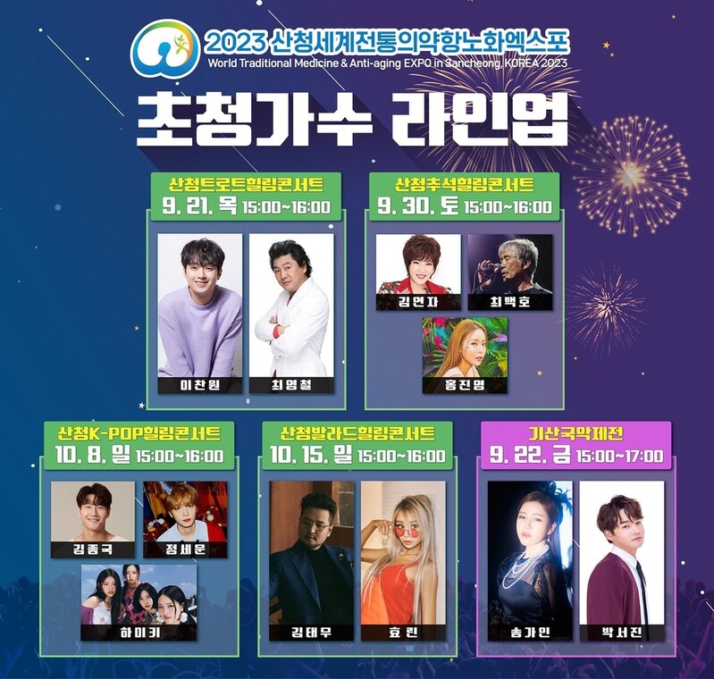 '2023 산청세계전통의약항노화엑스포 조직위원회'는 엑스포 기간에 주 행사장인 경남 산청군 동의보감촌 주 무대에서 다양한 장르의 가수 공연을 마련했다고 19일 밝혔다.