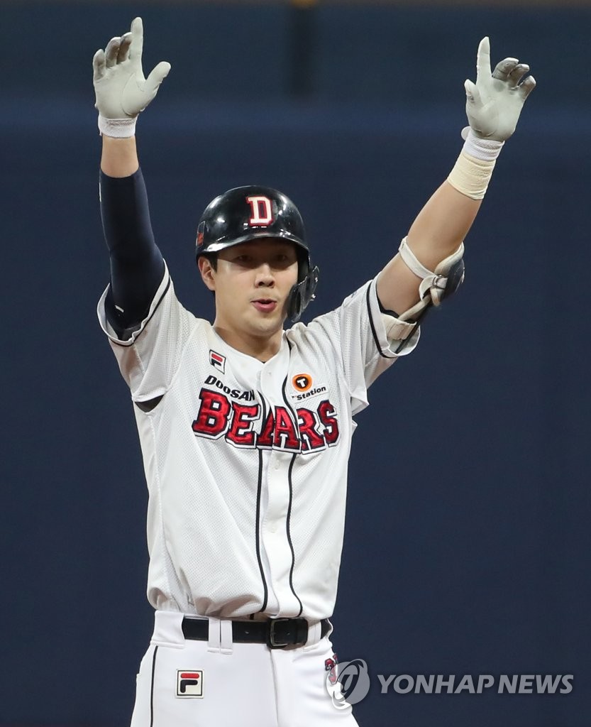 | ▲ In this file photo from Nov. 18, 2021, Park Kun-woo of the Doosan Bears celebrates a double against the KT Wiz in the bottom of the sixth inning of Game 4 of the Korean Series at Gocheok Sky Dome in Seoul. (Yonhap) |
