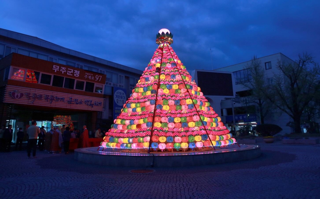 (무주=연합뉴스) 석가 탄신일(19일)을 앞두고 3일 전북 무주군청 앞 광장에 연등 탑이 붉을 밝혔다.