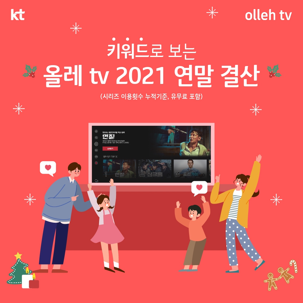 올레tv가 빅데이터를 통해 키워드 및 분야별 시청 순위 등을 분석한 결과, 올해 올레tv를 대표하는 키워드는 '키즈랜드 전성시대', '개인취향(개취) 존중', '집콕가족'이었다.
