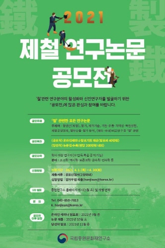 중원문화권 조사연구를 추진하고 있는 문화재청 국립중원문화재연구소(소장 문재범)는 젊고 참신한 제철 연구자를 발굴하고 제철 관련 연구 활성화를 모색하기 위해 제철 관련 연구논문을 공개 모집한다.