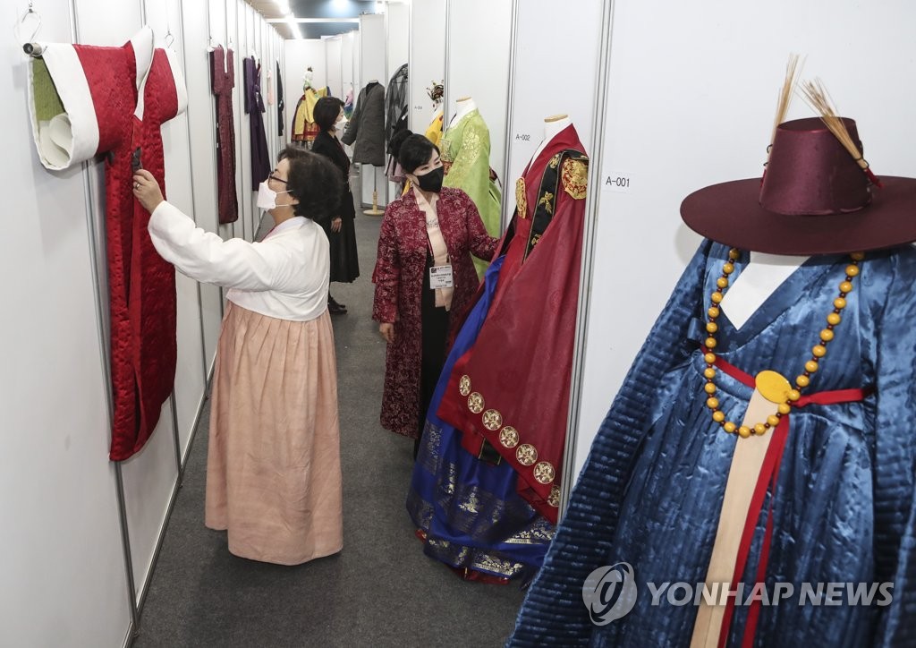 | ▲ 2021 부산 국제신발 섬유 패션전시회 개막 (부산=연합뉴스) 강덕철 기자 = 28일 부산 해운대구 벡스코에서 열린 '2021 부산 국제신발·섬유 패션전시회'에서 전통의상들이 전시되고 있다. 2021.10.28 kangdcc@yna.co.kr |