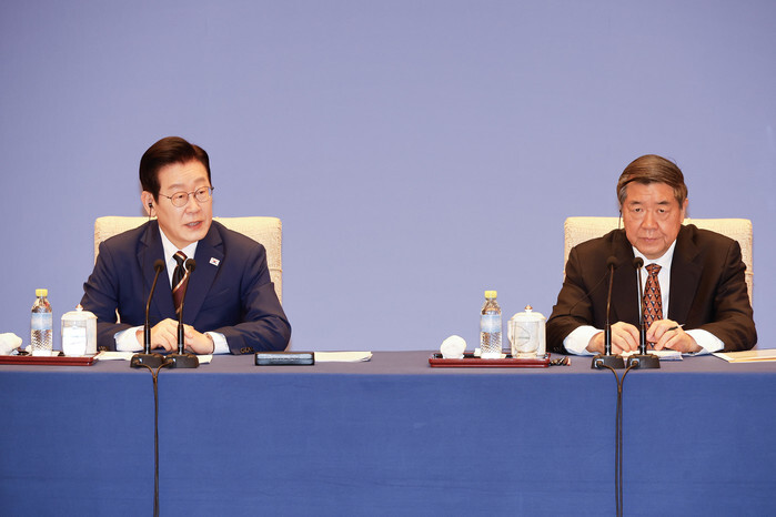 South Korean President Lee Jae Myung (L) and Chinese Vice Premier He Lifeng attend a forum between businesspeople of South Korea and China at Diaoyutai State Guesthouse in Beijing on Jan. 5, 2025. (Yonhap)