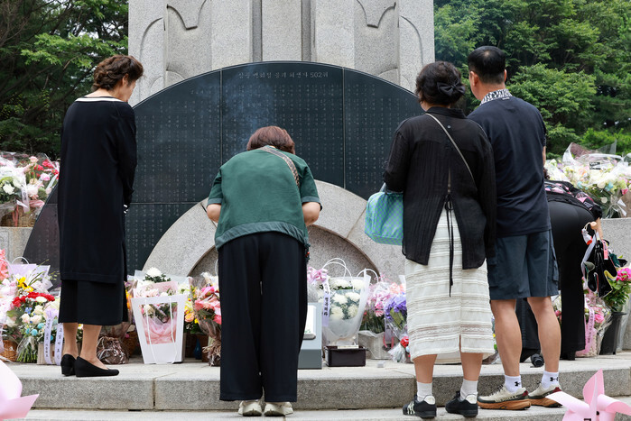 Bereaved family members of victims of the Sampoong Department Store collapse pay their respects at a memorial in southern Seoul on the 30th anniversary of the disaster on June 29, 2025. (Yonhap)