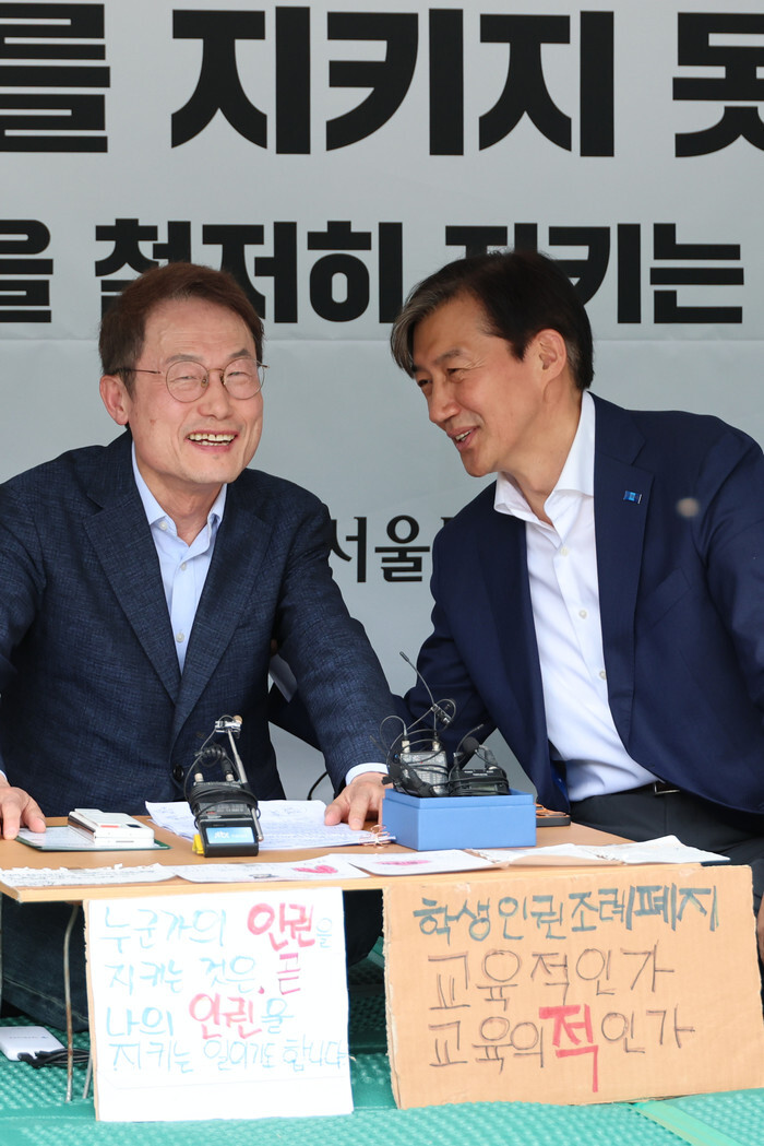 Rebuilding Korea Party leader Cho Kuk (R) meets Cho Hee-yeon, superintendent of the Seoul Metropolitan Office of Education, protesting the abolition of a student rights ordinance, in central Seoul on April 28, 2024. (Yonhap)