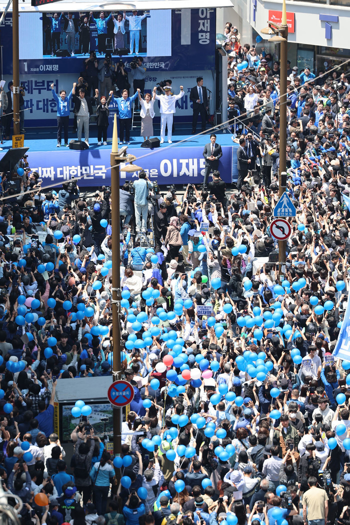 Lee Jae-myung (4th from L, on stage), the presidential candidate of the liberal Democratic Party, poses for a group photo with the party's members during a stump stop in the southeastern port city of Busan on May 14, 2025, ahead of the June 3 presidential election. (Pool photo) (Yonhap)