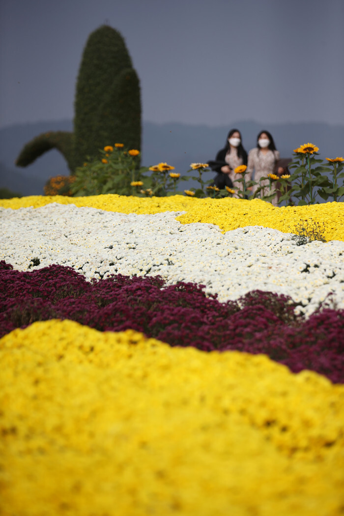 Visitors walk through a field of chrysanthemum flowers in Hwasun, a town in South Korea's southwestern province of South Jeolla, on Oct. 27, 2021. (Yonhap)