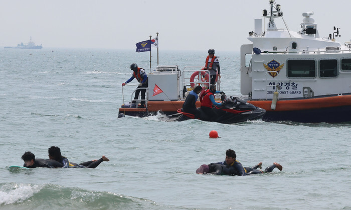 Rescuers from the Coast Guard take part in a drill off Haeundae Beach in the southeastern port city of Busan on June 19, 2025, under the scenario that a riptide, gusts and other disasters caused by climate change hit swimmers at the famous bathing beach. (Yonhap)