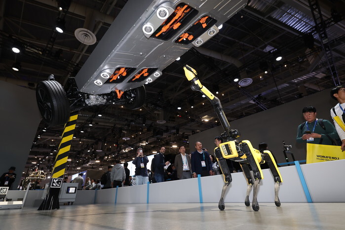 Spot, Hyundai Motor Group's four-legged robot dog, demonstrates how to repair a vehicle at the group's booth at the CES technology show, one of the world's largest IT and home appliance trade fairs, in Las Vegas, Nevada, on Jan. 6, 2026, after the four-day event opened with about 4,500 companies taking part. (Yonhap)