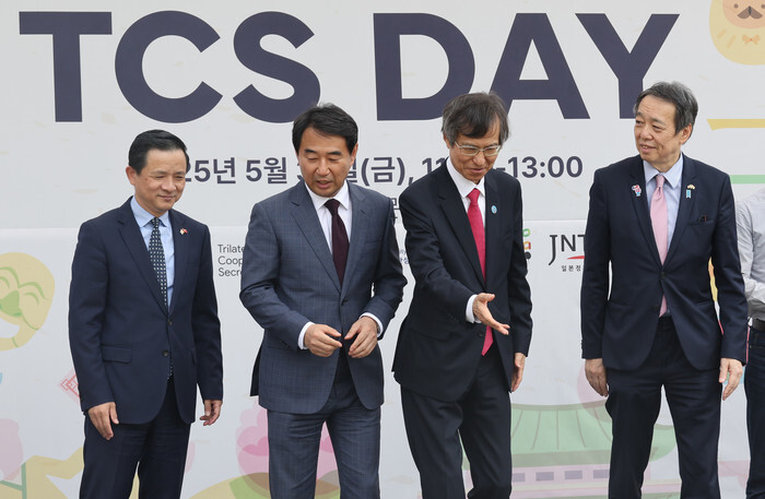 (From L to R) Chinese Ambassador to South Korea Dai Bing; Jung Ki-hong, South Korea's ambassador and deputy minister for public diplomacy; Lee Hee-sup, South Korea's chief of the Trilateral Cooperation Secretariat; and Japanese Ambassador to South Korea Koichi Mizushima attend an event at Gwanghwamun Plaza in Seoul on May 30, 2025, to celebrate the Day of Cooperation among South Korea, Japan and China that was designated following the signing on May 30, 2010, of a pact to establish the secretariat involving the three Northeast Asian countries. (Yonhap)