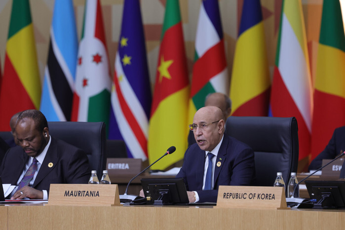 Mohamed Ould Ghazouani (R), chairperson of the African Union, delivers a welcoming speech during the opening ceremony of the 2024 Korea-Africa Summit at the Shilla Hotel in Seoul on June 4, 2024. (Yonhap)