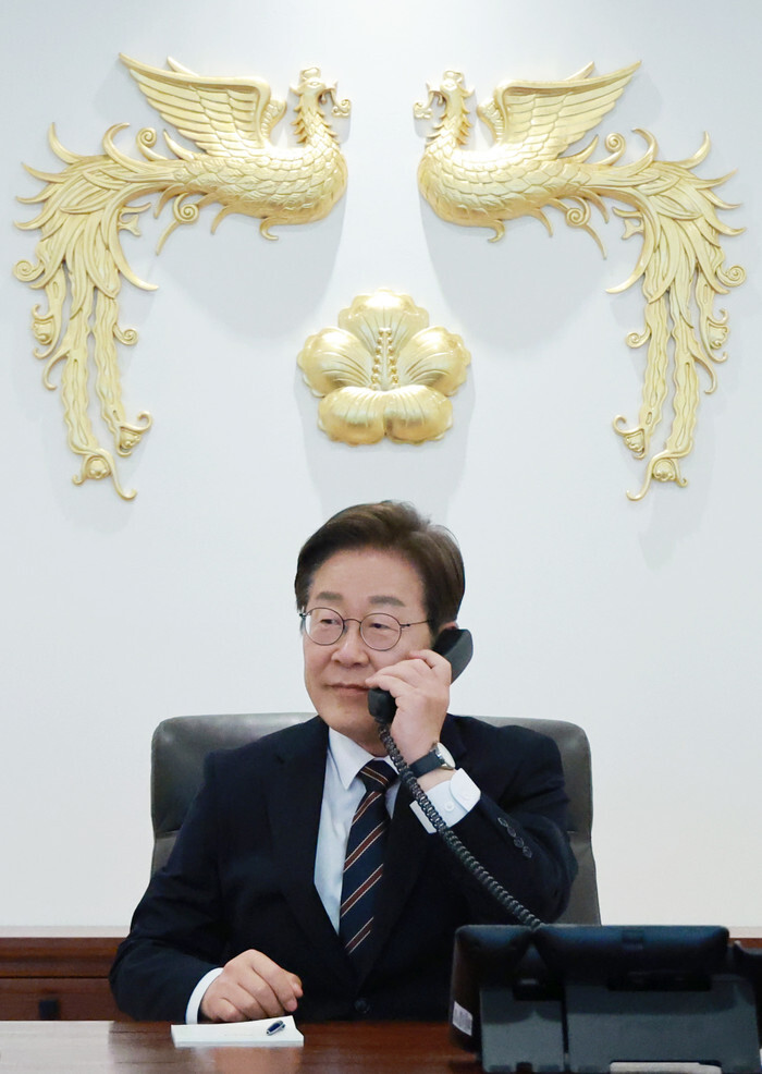 President Lee Jae-myung speaks by phone with Japanese Prime Minister Shigeru Ishiba at the presidential office in Seoul on June 9, 2025. (Yonhap)