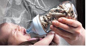 The manual requires companies to have more graphic warnings on cigarette products. For example, a warning on second-hand smoking includes a rendered image of a newborn child sucking on a baby bottle stuffed with cigarette butts.