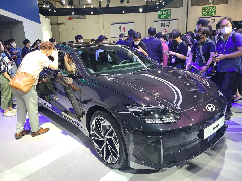 | ▲ This photo taken July 14, 2022, shows reporters taking a look at Hyundai Motor's IONIQ 6 electric sedan during the press day of the Busan Motor Show in Busan, 453 kilometers south of Seoul. (Yonhap) |