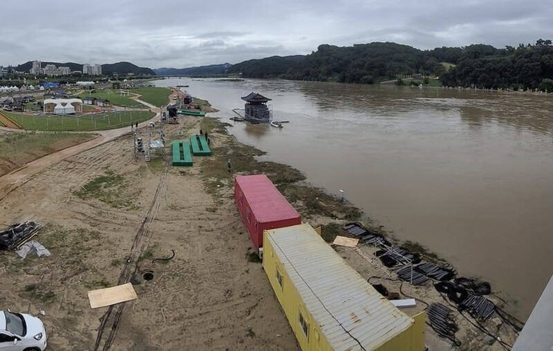 35개 지역 환경단체 등으로 구성된 '보 철거를 위한 금강·영산강 시민행동'은 "수문 담수로 행사장 미르섬 주변의 수위가 상승했고 강우로 행사 시설물이 유실됐다"며 "이번 피해로 보가 홍수 예방 시설이 아니라 홍수 위험을 가중하는 시설이라는 것이 다시 한번 입증됐다"고 주장했다.