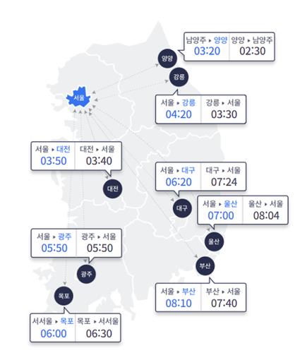 반대로 전국 각지를 출발해 서울 요금소까지 걸리는 시간은 부산 7시간 40분, 울산 8시간 4분, 대구 7시간 24분, 광주, 5시간 50분, 강릉 3시간 30분, 대전 3시간 40분이다.