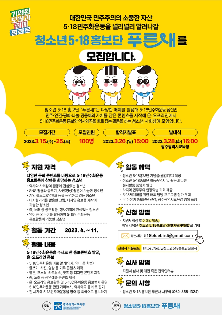 자세한 사항을 확인하려면 시교육청 누리집을 방문하거나 청소년 5·18 홍보단 푸른새 사무국(☎062-368-1324)으로 문의.