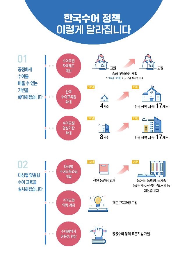 우선 한국수어 제도 및 기반을 확대한다. 농인 등을 위한 한국수어교육원과 한국수어교원 양성 교육기관을 각각 17곳(전국 17개 광역시·도별 1곳)으로 확대한다.