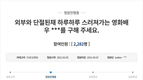 앞서 한 청원인은 지난 5일 청와대 국민청원 게시판에 '외부와 단절된 채 하루하루 쓰러져가는 영화배우 윤정희를 구해 주세요'라는 제목의 글을 올렸다. 요건 위배 등의 사유로 현재 관리자에 의해 윤정희 등의 실명은 가려졌다.